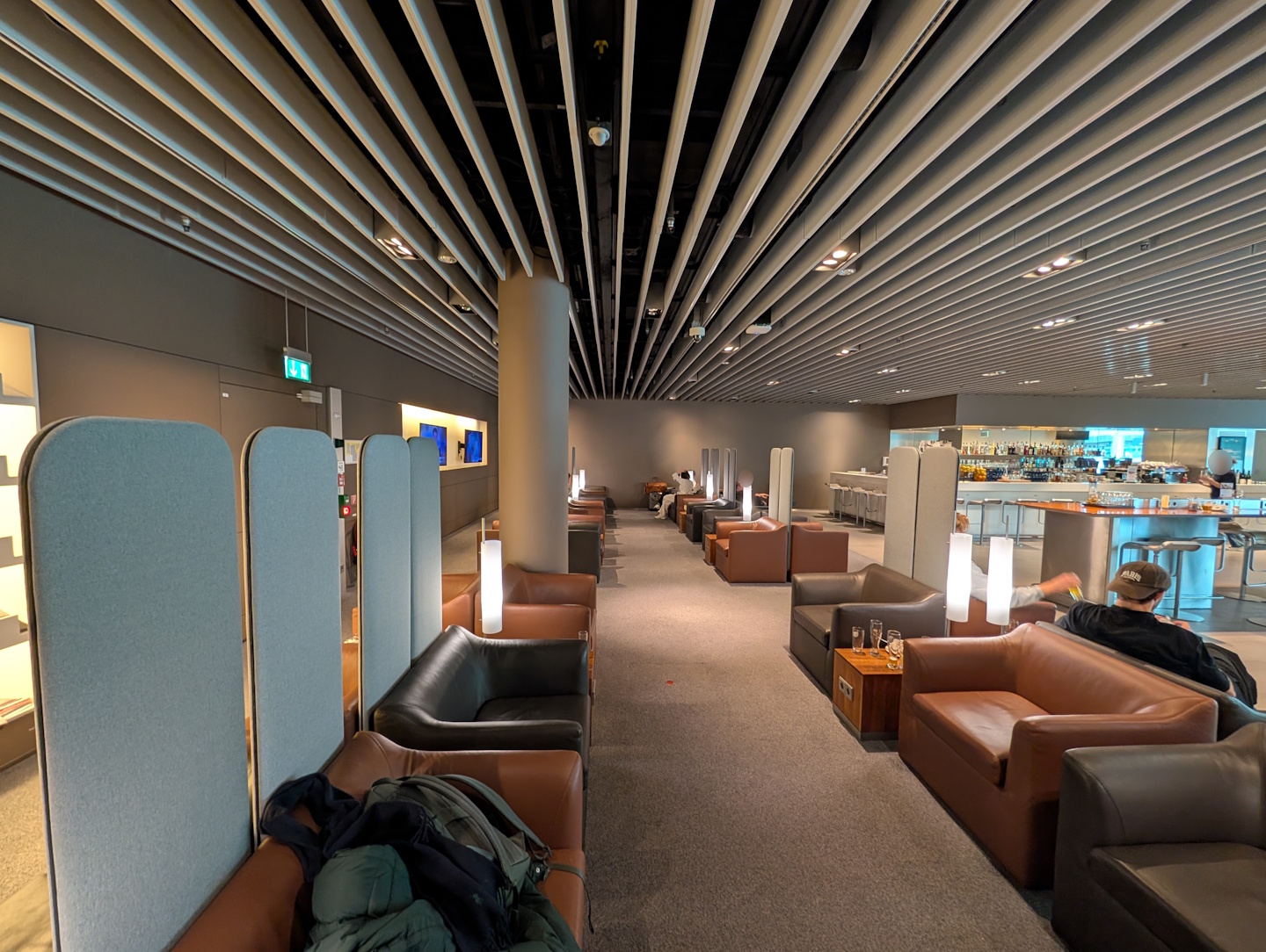 Während bei Tage der Aufenthalt im vorderen Lounge-Bereich deutlich angenehmer ist (hier befinden sich entlang der Fensterfront auch einige Lounge-Möbel) leidet dieser Bereich jedoch unter einem Mangel an Steckdosen, die im hinteren Bereich grundsätzlich wie von Senator-Lounges gewöhnt an jedem Sitzplatz vorhanden sind.