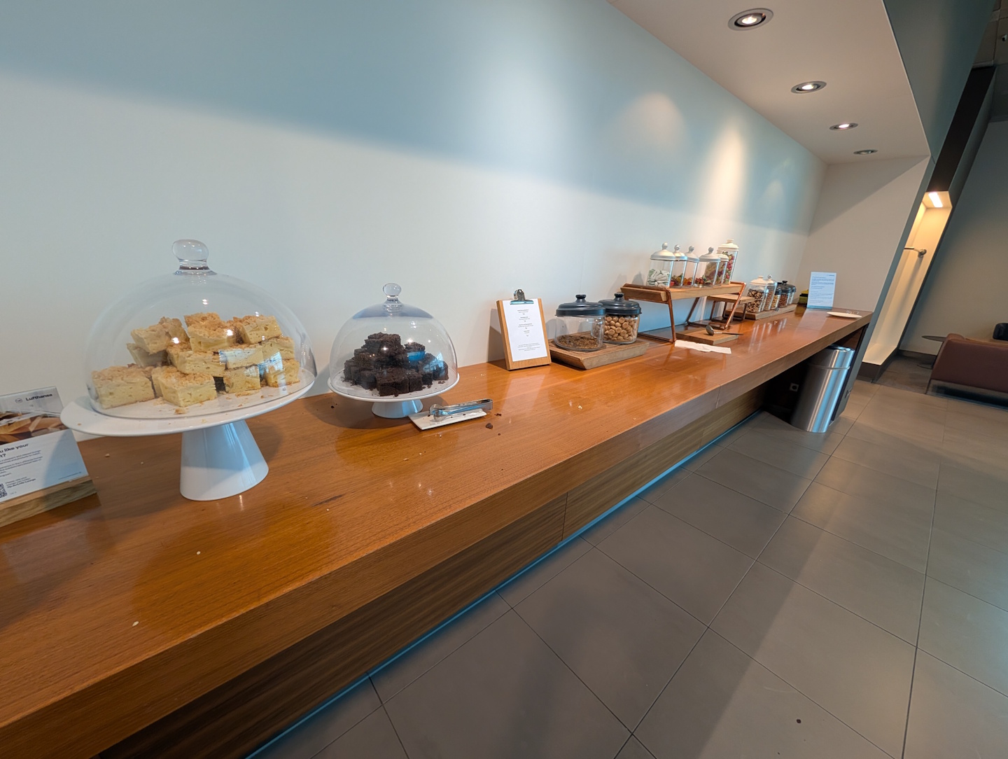 Ich muss sagen, dass mich das Speisenangebot nicht wirklich angesprochen hat; gerade angesichts der Tatsache, dass es sich hier um eine Non-Schengen-Lounge handelt, deren Besucher in der Regel lange Flüge vor- oder hinter sich haben und die ggf. eine Mahlzeit im Flugzeug nachholen oder vorwegnehmen möchten, hätte die Auswahl durchaus für meine Begriffe ein wenig umfangeicher sein dürfen.