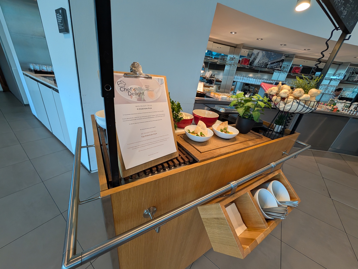 Zusätzlich gab es, wie in Senator-Lounges seit einiger Zeit üblich, ein Spezialgericht, das direkt an einem separaten Counter frisch angerichtet wurde. Dieses war gegen 13 Uhr dann aber vergriffen.
