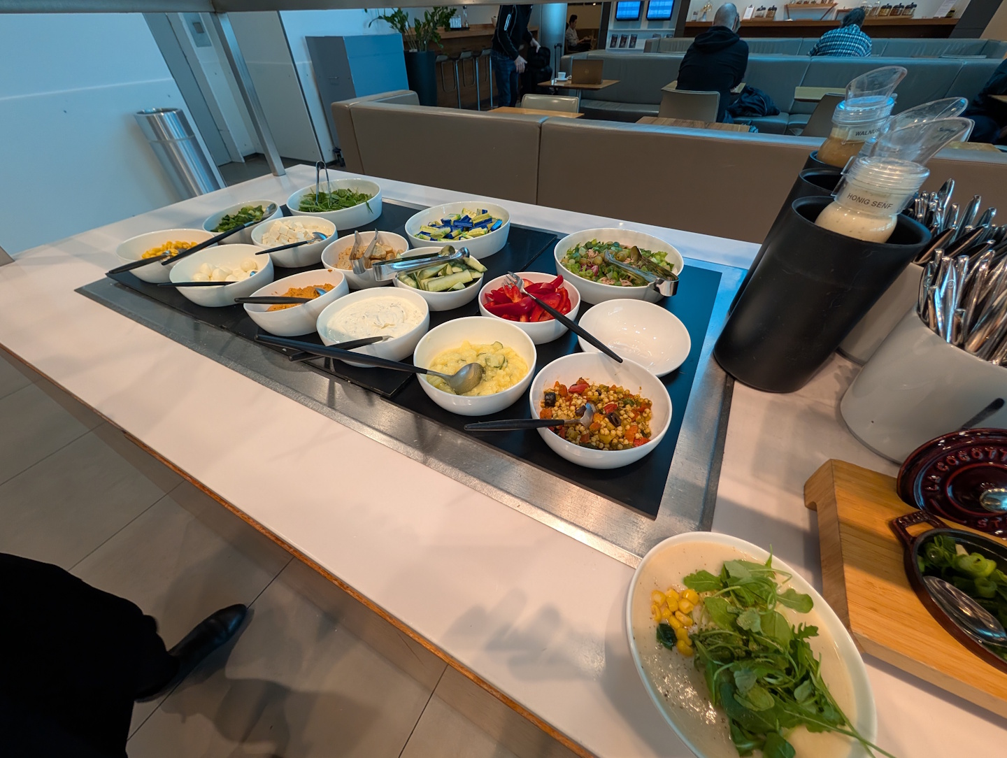 Speisentechnisch wurde die von einer Lufthansa Senator-Lounge erwartbare Auswahl an kalten und warmen Speisen geboten, will meinen, eine Auswahl an Salat und eine kleine Auswahl warmer Gerichte vom Buffet. Vermisst habe ich hier dieses mal jedoch eine lokale Option (sonst war ich es gewöhnt, dass eigentlich immer mindestens ein Leberkas erhältlich war), wenn man einmal von der Auswahl an Brezeln absieht.