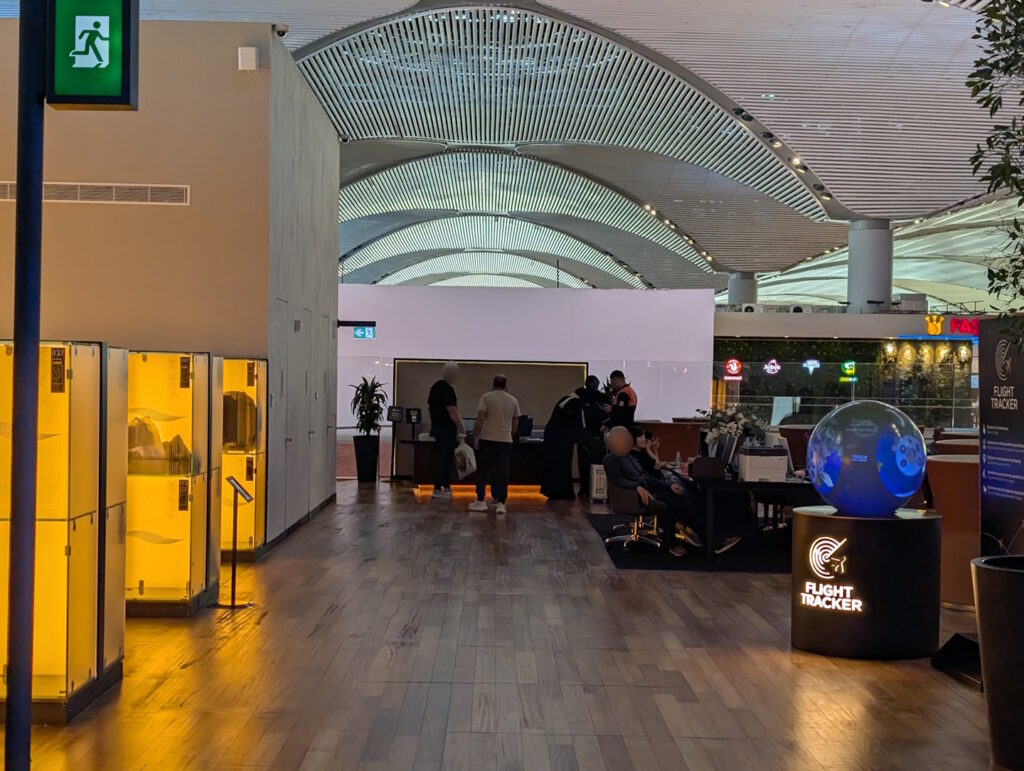 Dort findet man eine üppig dimensionierte Vereinzelungsanlage mit automatischer Zugangskontrolle zur Lounge und einen kleinen Informationsschalter vor – interessant ist, dass die Bordkarten hier nicht nur beim Betreten, sondern auch beim Verlassen der Lounge gescannt werden müssen.