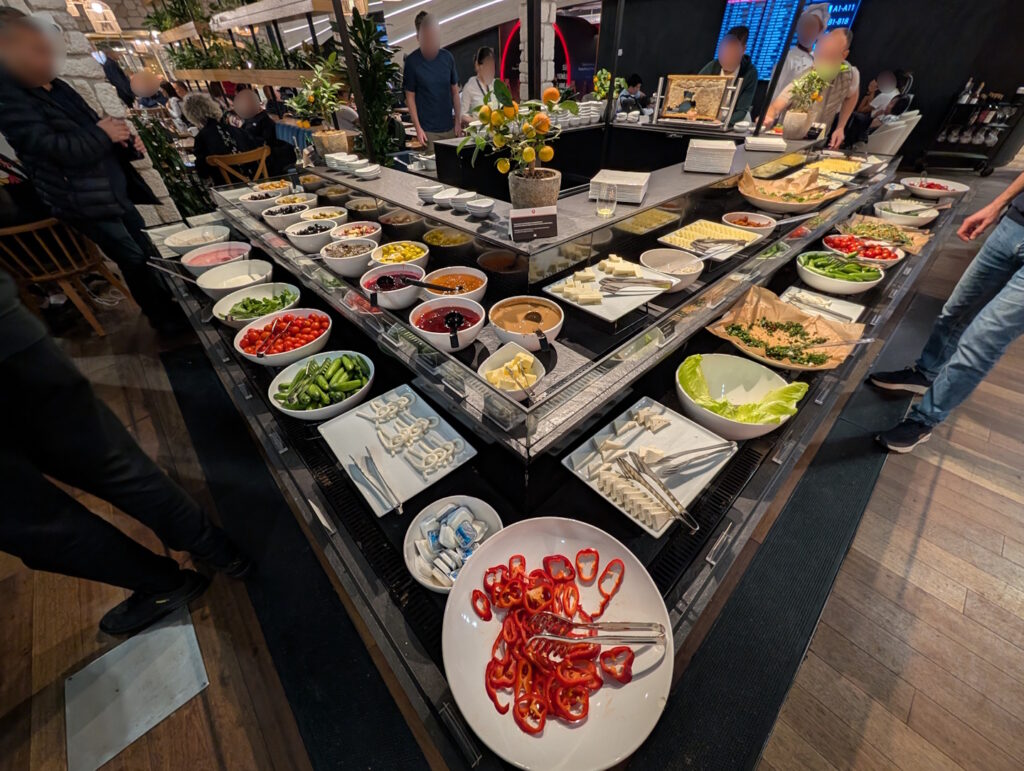Insgesamt wirkte die Auswahl an Speisen in der Lounge (zumindest gesetzt den Fall, dass wirklich alle Live Cooking-Stationen geöffnet und besetzt sind) überdurchschnittlich. Aufgrund des hohen Andrangs am Live-Cooking habe ich dann jedoch nur eine Auswahl von Mezze vom Buffet und eine der frischen Backwaren probiert, deren Qualität einwandfrei war. Schade fand ich nur, dass insbesondere aufgrund der hohen Auslastung der Lounge nicht alle Kochstationen besetzt waren (selbst wenn man hier nur die gleichen Gerichte angeboten hätte), denn das hätte die langen Wartezeiten dort sicherlich abgemildert.