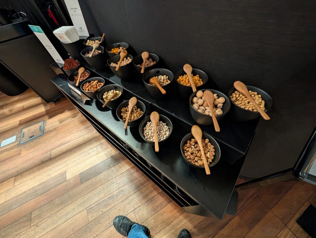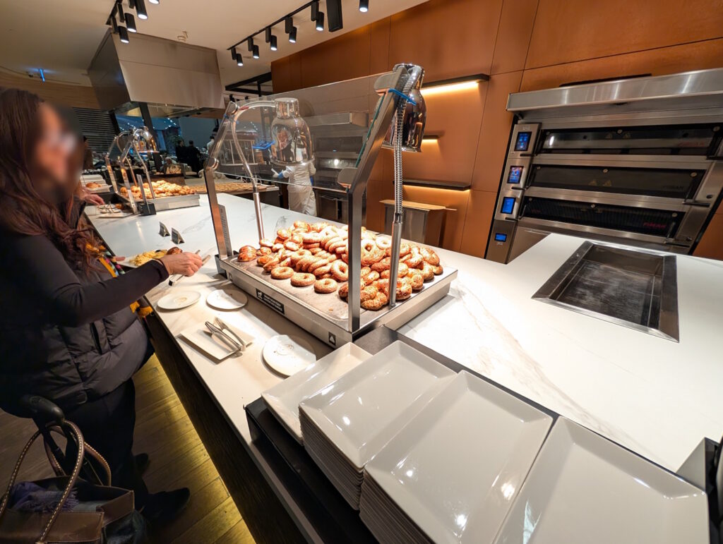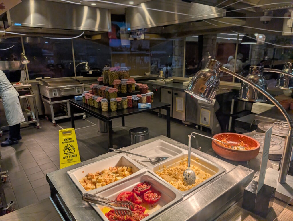 Was in der Turkish Airlines Business Lounge direkt ins Auge fällt ist die große Anzahl von Live Cooking-Stationen. In der Mitte des Speisebereich finden sich zwei kioskartige Konstruktionen, die über jeweils vier Ausgaben für Speisen, die dort hinter Glas frisch zubereitet werden, verfügen. Leider waren zum Zeitpunkt unseres Besuchs (wir waren wie gesagt am frühen Morgen dort) nur drei davon überhaupt geöffnet, die jeweils ein Gericht angeboten haben. Da sich auch hier lange Schlangen davor befanden, habe ich davon abgesehen, mir hier etwas zu Essen zu holen.