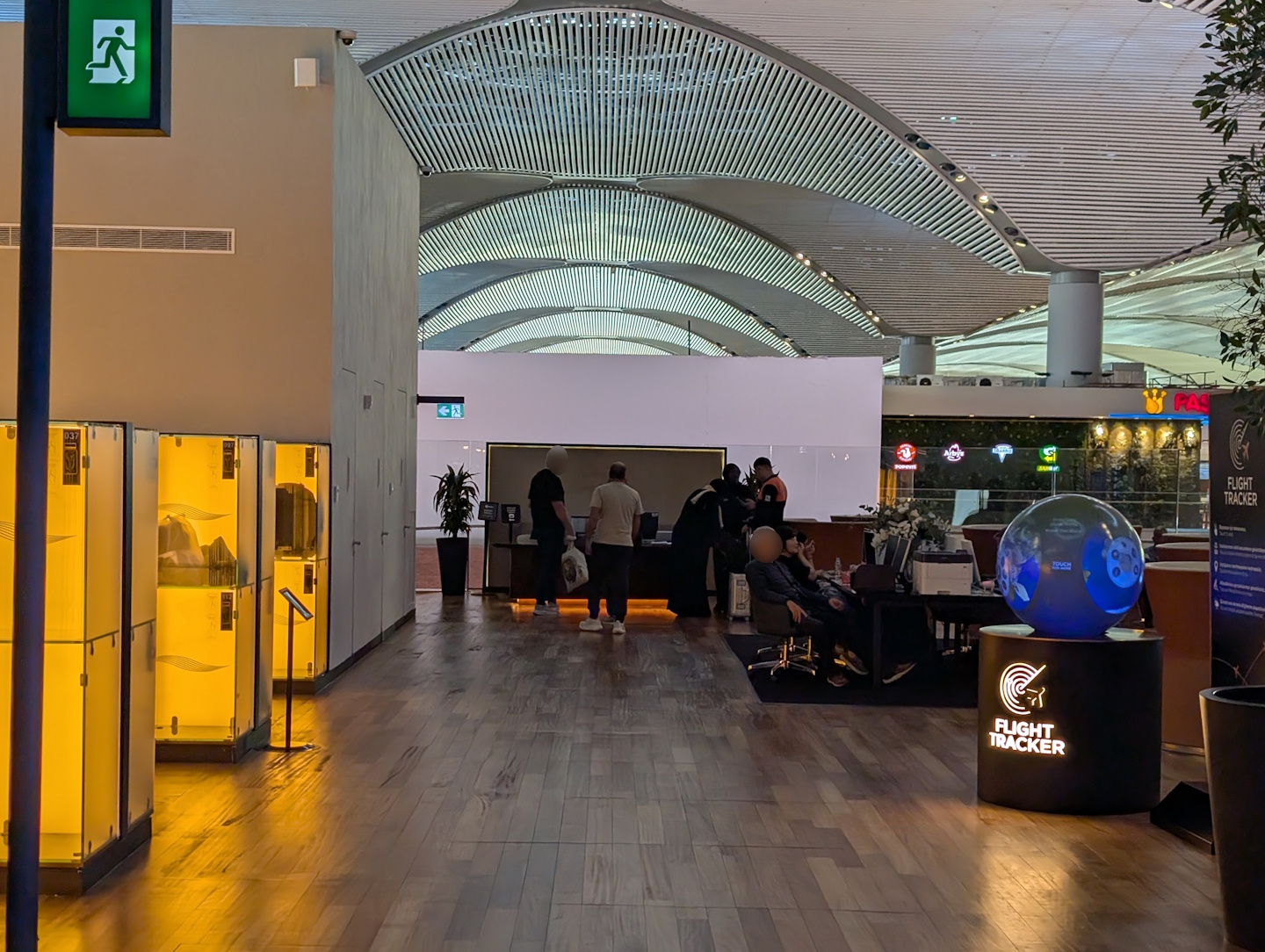 Die gesamte Lounge ist grob in drei unterschiedliche Bereiche eingeteilt. Betritt man die Lounge vom Eingang her, findet man linker Hand einen Arbeitsbereich, eine Schließfachanlage für Gepäck und zum Laden von Mobiltelefonen und die Rezeption für Duschen und private Ruheräume.