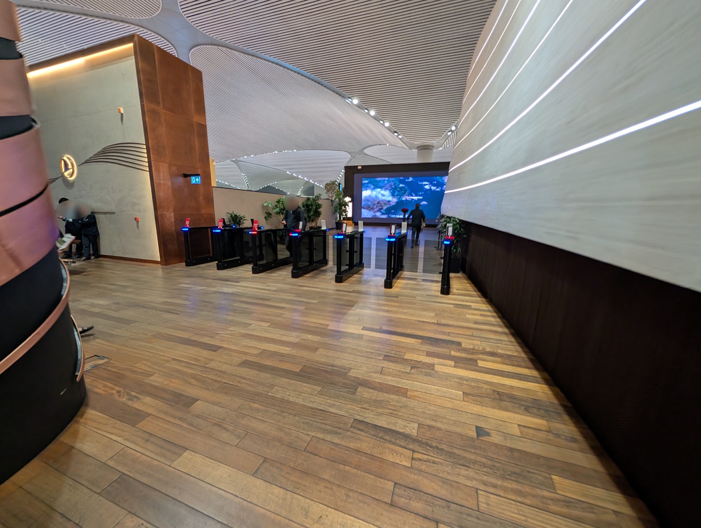 Dort findet man eine üppig dimensionierte Vereinzelungsanlage mit automatischer Zugangskontrolle zur Lounge und einen kleinen Informationsschalter vor – interessant ist, dass die Bordkarten hier nicht nur beim Betreten, sondern auch beim Verlassen der Lounge gescannt werden müssen.
