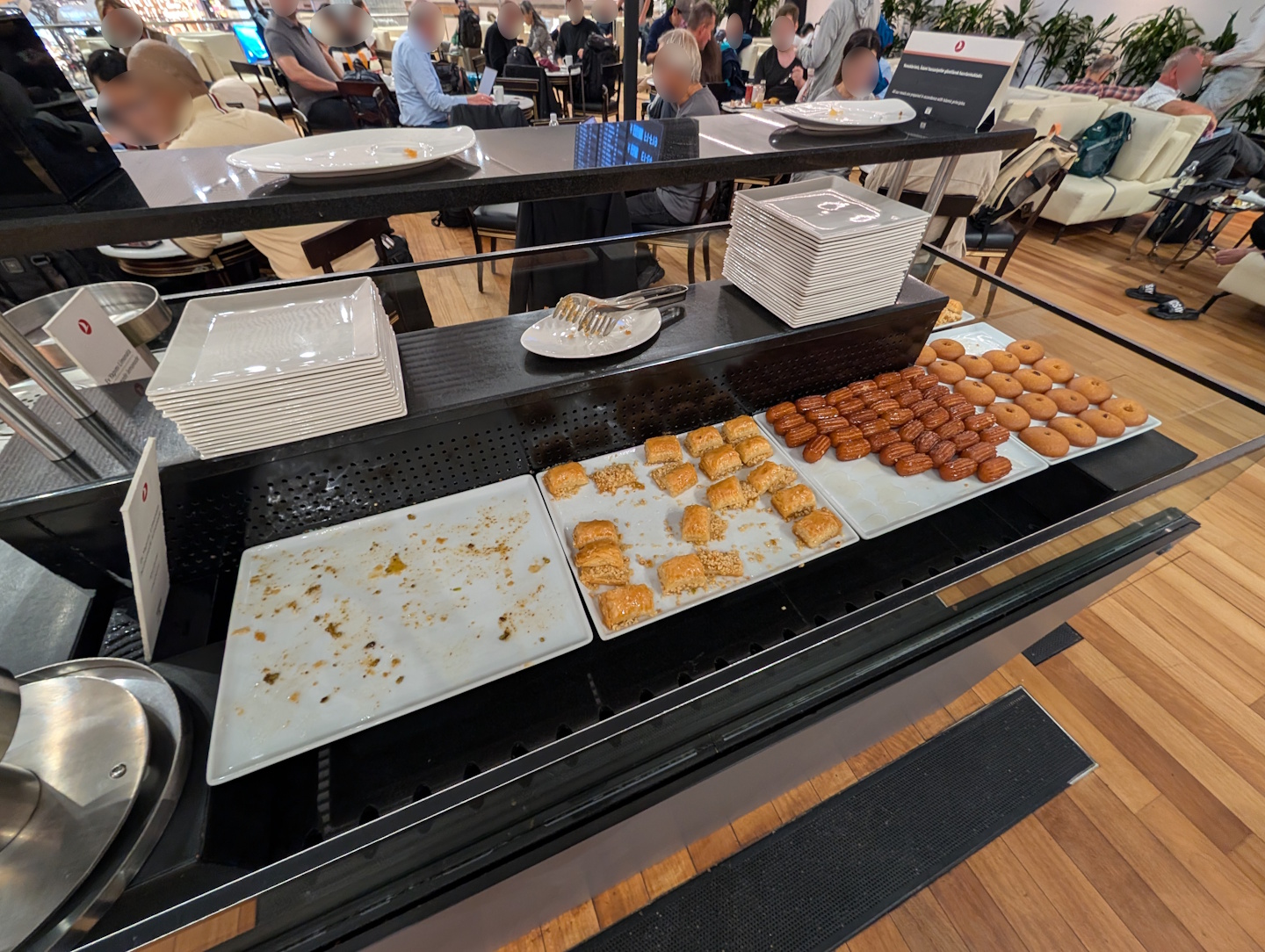 Insgesamt wirkte die Auswahl an Speisen in der Lounge (zumindest gesetzt den Fall, dass wirklich alle Live Cooking-Stationen geöffnet und besetzt sind) überdurchschnittlich. Aufgrund des hohen Andrangs am Live-Cooking habe ich dann jedoch nur eine Auswahl von Mezze vom Buffet und eine der frischen Backwaren probiert, deren Qualität einwandfrei war. Schade fand ich nur, dass insbesondere aufgrund der hohen Auslastung der Lounge nicht alle Kochstationen besetzt waren (selbst wenn man hier nur die gleichen Gerichte angeboten hätte), denn das hätte die langen Wartezeiten dort sicherlich abgemildert.