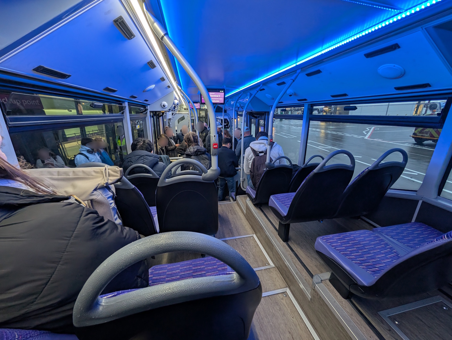 Die Dauer der Busfahrt wird im Bus auf einer Live-Anzeige der Restfahrzeit mit 8 Minuten angegeben. Der ganze Prozess kann sich aber deutlich länger hinziehen, da zum einen das Einsteigen durch nicht durchrückende Fahrgäste unnötig lang dauern kann und zum anderen ein Zwischenstopp am Satellitenterminal 5B eingelegt wird. Vor allem dort gab es bei unserer Fahrt das Problem, dass die dort wartenden Fahrgäste nicht zusteigen konnten, weil sich im Bus selbst alles an den Einstiegstüren drängte, obwohl hinten im Bus sogar noch Sitzplätze frei waren. Der Fahrer griff hier auch nicht ausreichend durch, so dass ich nur appellieren kann, Leute, rückt verdammt noch mal in Verkehrsmitteln durch, ganz egal, ob es sich um einen Linienbus, die U-Bahn oder den Boarding-Bus handelt. Dementsprechend empfehle ich bei Ankunft am Terminal 5B auch, zunächst mit der Kabinenbahn zum Hauptterminal 5A zu fahren und dort den (leer bereitgestellten) Bus zu besteigen, weil man sonst womöglich nicht wegkommt.