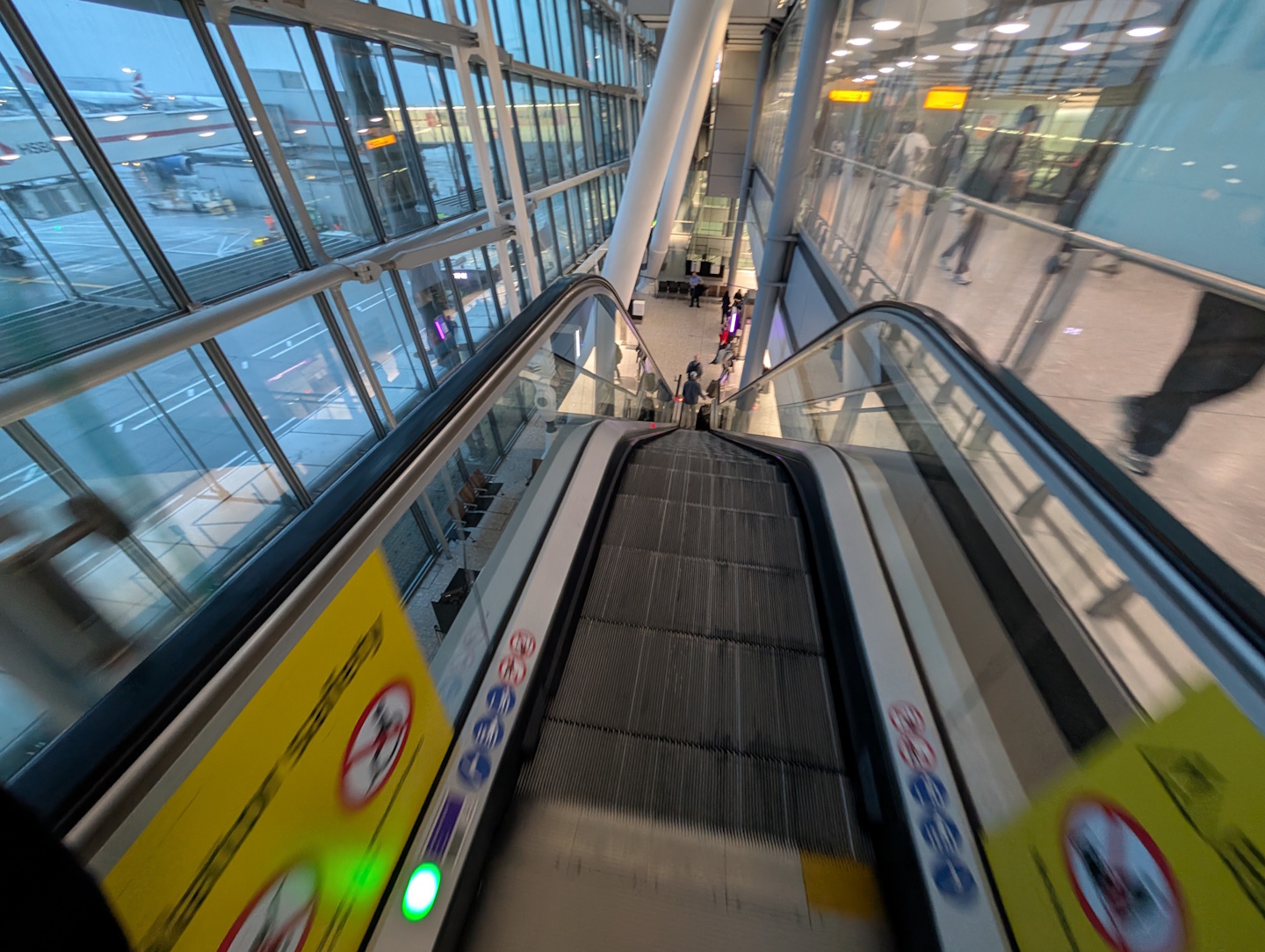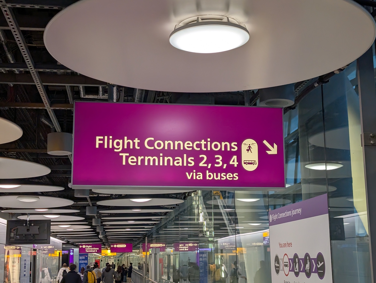 Irgendwann erreicht man den Punkt, an dem auf der Gebäudeinnenseite die Warteschlangen zur Einreisekontrolle beginnen. Hier wendet man sich nun aber auf die Gebäudeaußenseite, wo eine einzelne Rolltreppe nach unten zu einigen Bus-Gates führt. Von diesen fahren regelmäßig im Takt weniger Minuten Pendelbusse zu den anderen Terminals in Heathrow (für die Frequenz zum Terminal 3 wurde morgens um halb 8 eine Taktung von 5 Minuten angegeben).